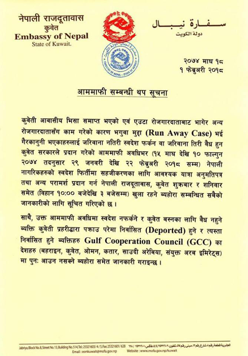 कुवेत सरकारले आममाफीको निर्णय गरेपछि नेपाली राजदूतावास कुवेतले गैरकानुनी भएर बसेका नेपाली कामदारहरुलाई तोकिएको अवधिभित्रै सहजिकरणका लागि दूतावासमा सम्पर्क गर्न सूचित गरेको छ ।