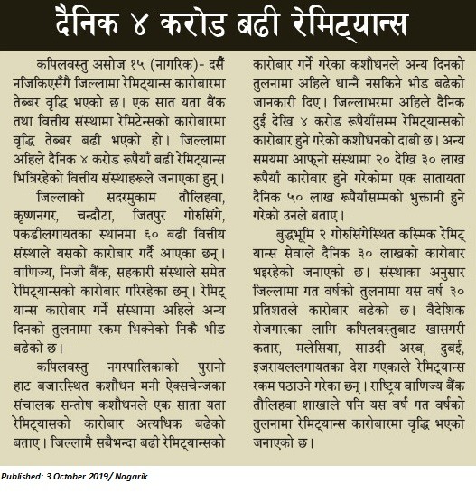 दैनिक ४ करोड बढी रेमिट्यान्स