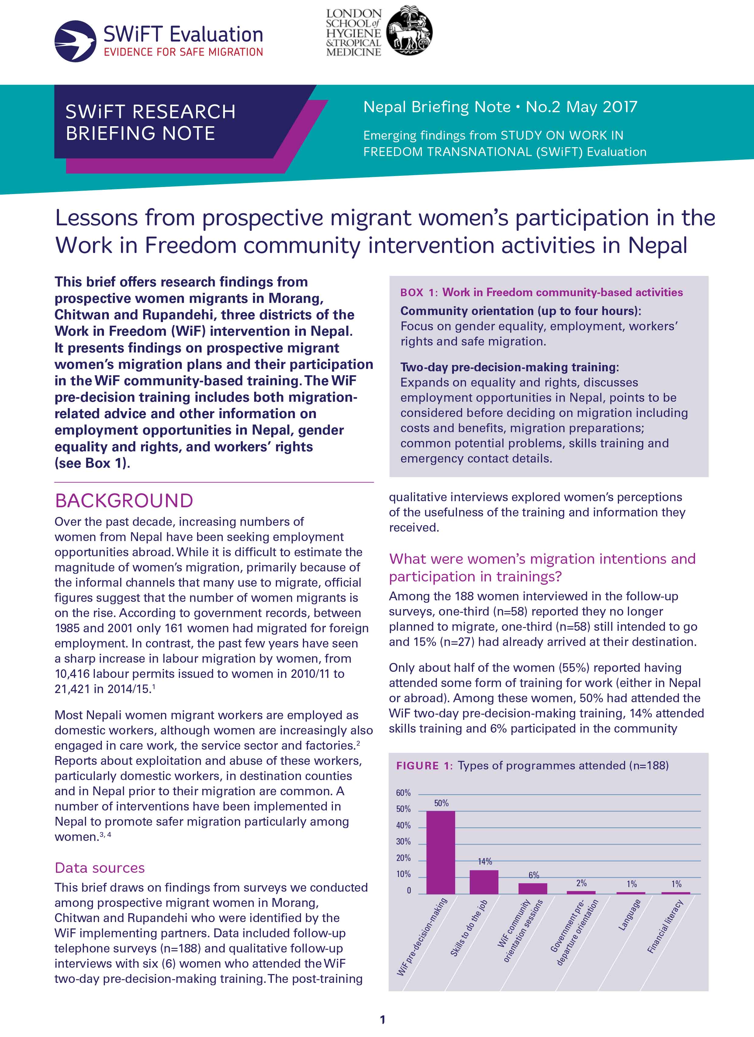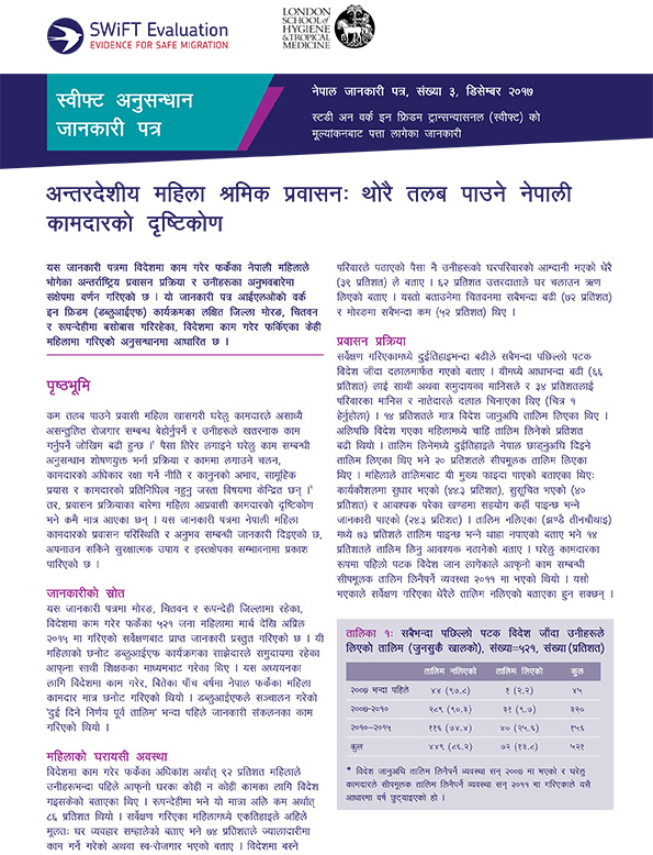 This brief offers research findings from prospective women migrants in Morang, Chitwan and Rupandehi, three districts of the Work in Freedom (WiF) intervention in Nepal. It presents findings on prospective migrant women’s ...