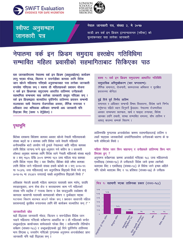यस जानकारीपत्रमा नेपालमा वर्क इन फ्रिडम (डब्लुआईएफ) कार्यक्रम लागू भएका मोरङ, चितवन र रुपन्देहीका कामका लागि विदेश जान खोज्ने महिलामा गरिएको अनुसन्धानबाट पत्ता लागेका जानकारी समावेश गरिएका छन् । यसमा ती महिलाहरुको ...