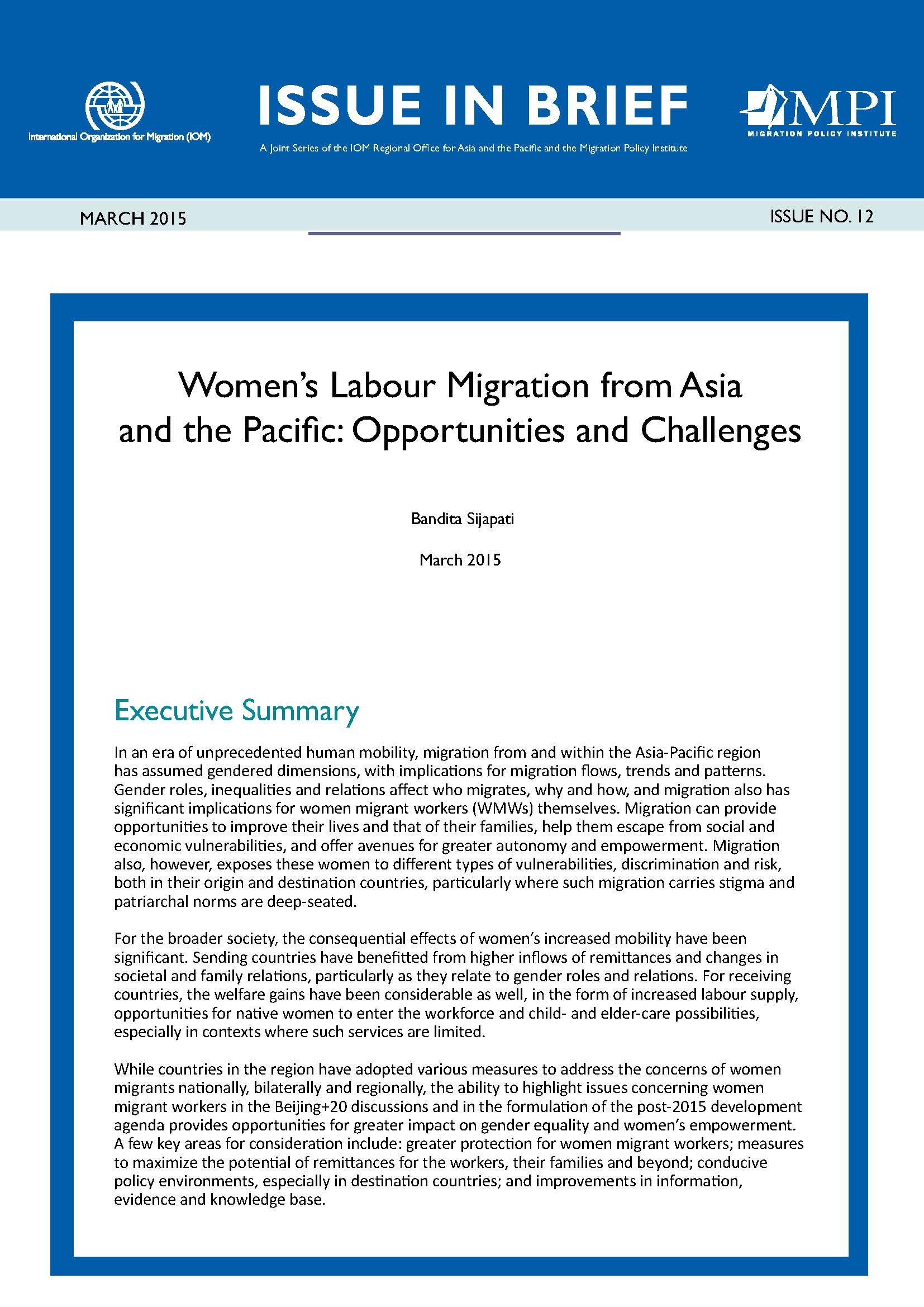 This issue in brief is the twelfth in the series of policy papers by the Migration Policy Institute (MPI) and the International Organization for Migration’s Regional Office for Asia and the Pacific ...